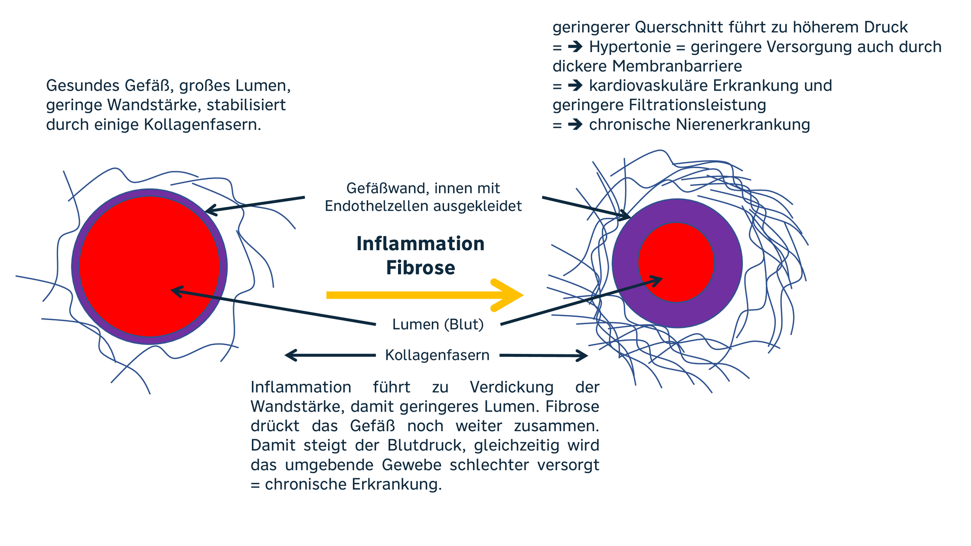 Der Bluthochdruck ist eine Reaktion des Körpers auf chronische Inflammation und Fibrose. Das Immunsystem wird „überschießend“ aktiviert. Mit zunehmender Schädigung der Innenwand-Zellen, dem Endothel, verdickt die Innenwand z.B. der Arterien, was wiederum den Druck des Durchflusses erhöht. Parallel dazu vermehren sich außerhalb der Blutgefäße die Kollagene, die eine Stabilitätsfunktion haben und nun selbst den Druck von außen auf die Blutgefäße verstärken.