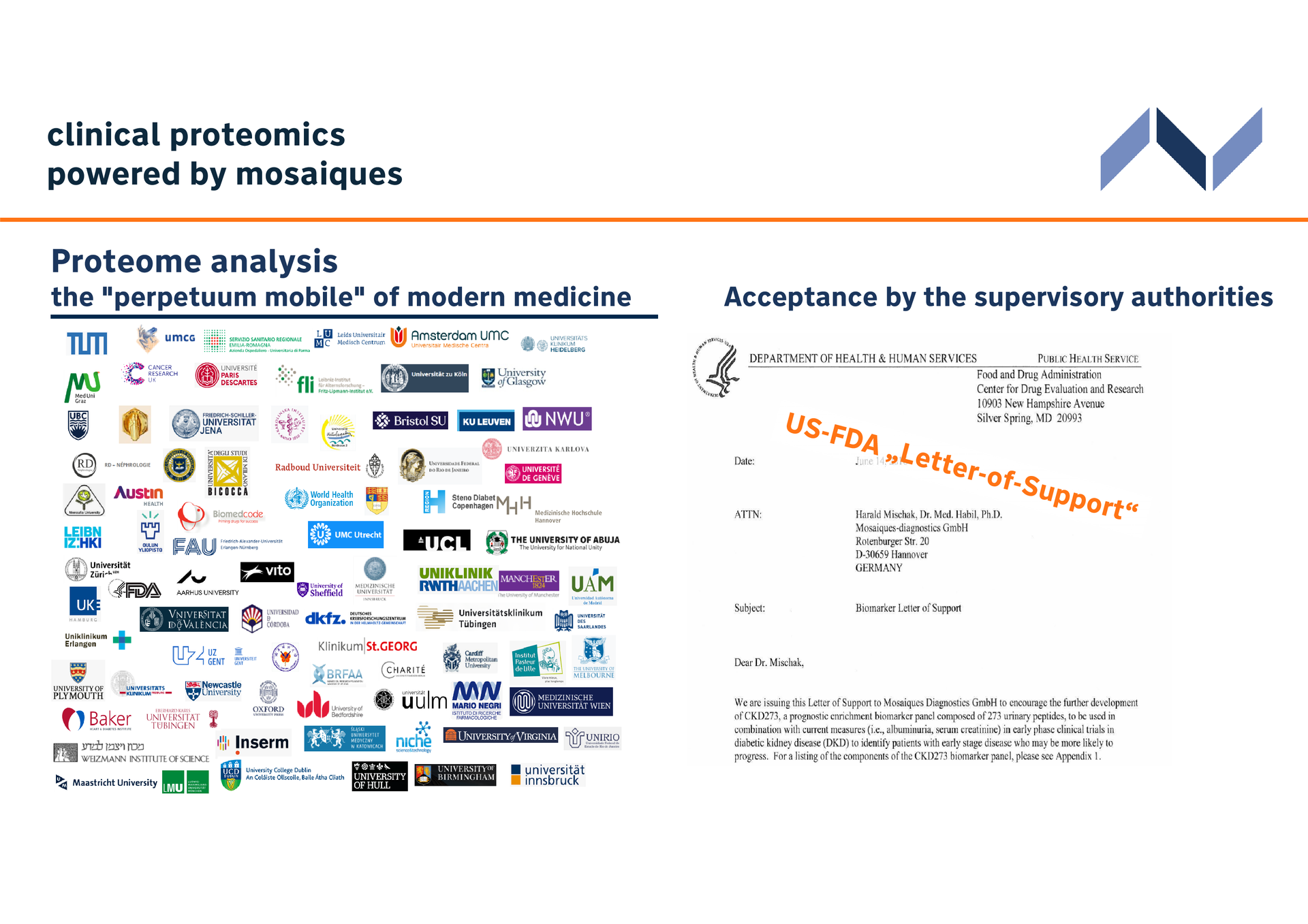 I reni sono un organo molto delicato con circa 1,7 milioni di unità filtranti (nefroni) per rene. Filtrano circa 1.700 litri di fluido, essenzialmente “sangue”, ogni giorno (24 ore) e trasmettono tutte le informazioni proteomiche che hanno causato i cambiamenti specifici della malattia. L'urina analizzata contiene fino a un milione di punti dati e fino a 12.000 proteine/peptidi.