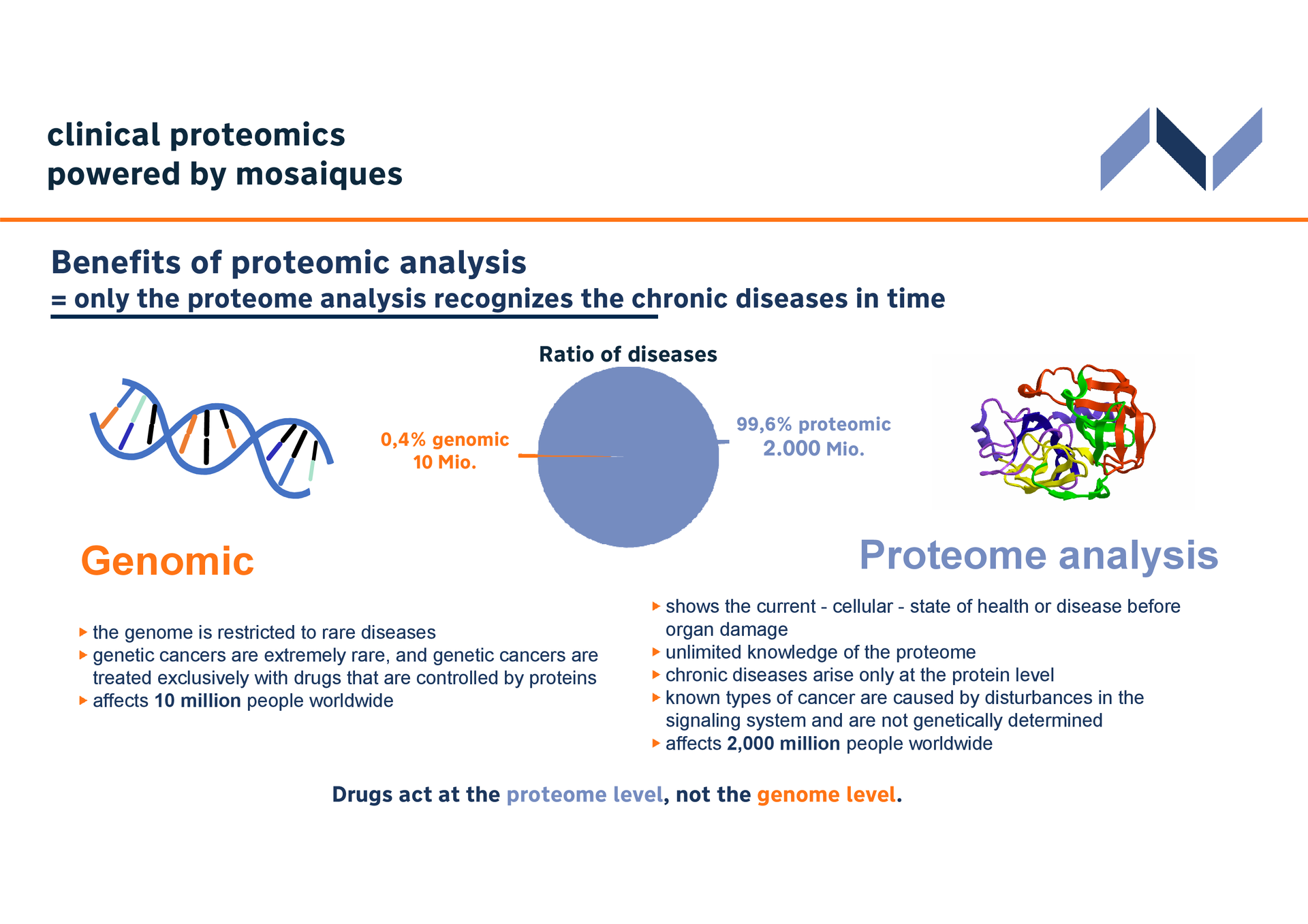 Il test del proteoma è molto preciso e può fornire informazioni affidabili molto presto sullo sviluppo di malattie croniche perché, per la prima volta, il proteoma viene decodificato e prelevato da un unico campione. Tutti i cambiamenti molecolari – cellulari – specifici della malattia sono controllati esclusivamente dalle proteine. La fonte primaria dell'analisi del proteoma è, tra molti altri fluidi corporei: l'urina! Si tratta del “filtrato del sangue”, estremamente stabile rispetto al sangue, ad esempio, che perde molte informazioni proteomiche significative anche se congelato a -80° Celsius.
