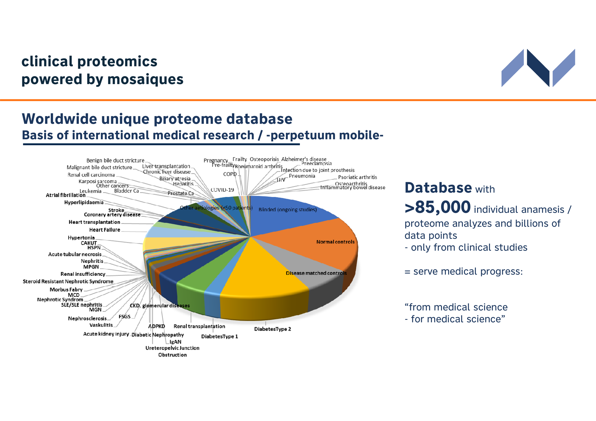 I test non invasivi del proteoma rilevano precocemente le malattie croniche a livello molecolare e cellulare. Gli algoritmi di autoapprendimento, che si basano su una combinazione di biomarcatori proteici specifici della malattia e intelligenza artificiale, sono stati convalidati in oltre 100 studi clinici. I benefici dei test offerti sono stati descritti dettagliatamente in oltre 400 pubblicazioni scientifiche, anche per il cancro, le malattie renali croniche e cardiovascolari.
